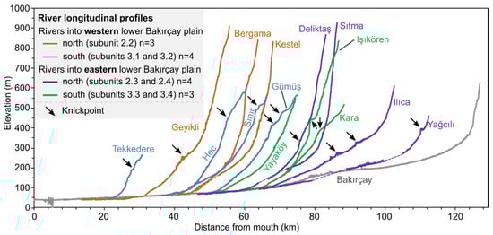 Longitudinal profiles of channel courses and major knickpoints in the Northern Highlands (geomorphological subunits 2.2–2.4) and Yunt Dağı Mountains (geomorphological subunits 3.1–3.4) enclosing the lower Bakırçay plain (see Figure 4 for the river courses). Note: c. 50× vertical exaggeration; reservoirs were manually modified with dashed lines.