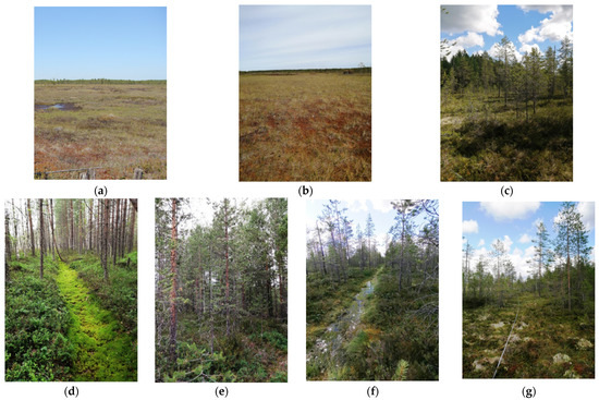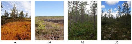 The undisturbed test sites are oligotrophic dwarf shrub-sphagnum phytocenoses on oligotrophic peats of different thickness. An overall view of the test sites is shown in Figure 3. The drained test sites at the present stage are dwarf-sphagnum pine forests on peat soils. In pristine areas of studied bogs, the natural forest stand is confined to the hummock of the hummock–hollow complex. Therefore, the forest stand was investigated on the hummocks adjacent to the investigated carpet plant communities. The characteristics of the tree layer of the investigated test sites are presented in Table 1.