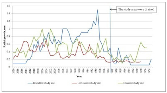 The dynamics of annual radial growth was investigated by measuring the width of annual rings of model pine trees (the trees had values of the height and diameter close to the average values of the whole studied forest stand) (Figure 4). The response of the forest stand to drainage is manifested after 4–6 years. In this case, the average width of the annual ring increases to 0.8–1.5 mm relative to the undisturbed area (0.2–0.3 mm). On the drained study area there is a stable increase of the radial growth relative to the undisturbed study area (up to 0.8–1.0 mm) (Figure 4). On the rewetted study area, the annual radial growth gradually decreases (starting from 1980, according to Figure 4). Its active decrease is observed after 1997–1998 to the values lower than in the undisturbed area.