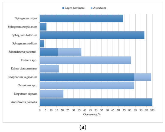 The poor species composition of the ground vegetation cover of undisturbed areas (6 species of vascular plants; 5 species of sphagnum mosses; 1 species of liverwort) is characteristic of the pine-cotton grass–sphagnum phytocenoses of northern taiga oligotrophic peat bogs [55]. The dominants and edificators are sphagnum mosses, forming a continuous mat. In the spatial structure of the site, Sphagnum majus, S. balticum and S. medium dominate. Herbs (mainly Eriophorum vaginatum) and shrubs (mainly Andromeda polifolia) are evenly distributed but occupy insignificant areas (Figure 5a and Figure 6).