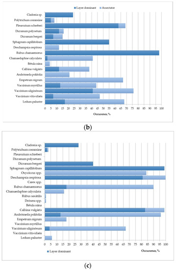Average species diversity and occurrence of certain species of ground vegetation cover for: (a) undrained test sites; (b) effectively drained test sites; (c) rewetted test sites.