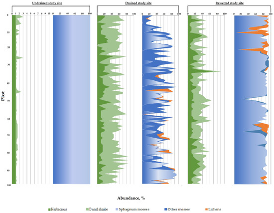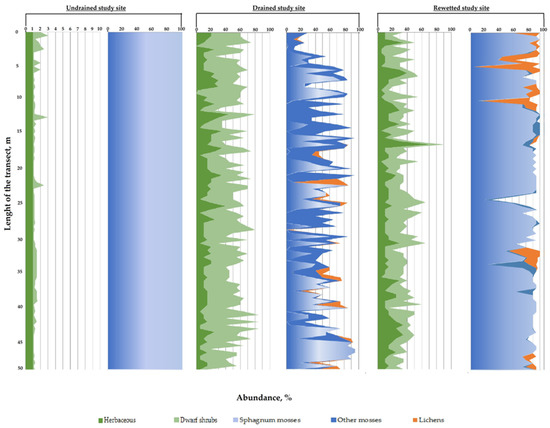 The study of the vegetation cover was carried out by laying out a transect 50 m long. At undisturbed study sites, transects were laid out in the most characteristic place of the bog plant communities (4 transects). At the drained and rewetted study sites, transects were laid out in the center of the inter-trench space and along the drainage ditch (2 transects per study site). The geobotanical description of the test sites was carried out according to the methodological recommendations and standard techniques at the plots 0.5 × 0.5 m [30,31,32,33,34]. The spatial distribution of species was documented in detail by measuring their frequency of occurrence. Determination of the abundance was carried out using an established procedure by measuring the projective cover of enlarged vegetation groups, i.e., herbaceous, dwarf shrubs, sphagnum mosses, green mosses and lichens [31,32,35]. The species diversity of the herbaceous, dwarf shrub and lichen layers was determined according to the field guide [36]. The field guides [37,38] were used to identify the representatives of the moss layer plant communities