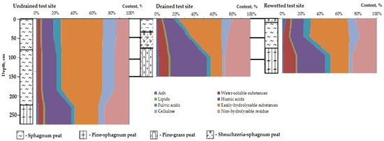 The content of difficultly-hydrolysable substances and non-hydrolysable residue in the studied peat samples varies in the range of 2.7–14.1% and 14.1–28.3%, respectively. The maximum values of difficultly-hydrolysable substances, which are based on the cellulose of the cell walls of the original plants, are characteristic of the upper layers of peat; then, it decreases with the depth and reaches minimum values in the bottom layers (on drained study site, up to 2.7%, and rewetted study site, up to 3.4%). For the bottom layer of the undrained site, the content of the difficulty-hydrolysable substances is twice as high and amounts to 6.7%. At the same time, from the data presented in Table 2, it can be seen that the drainage leads to a decrease in the share of difficulty-hydrolysable substances in peat. The lignin-like compounds are characterized by the opposite dynamics. On the contrary, their mass fraction increases with depth. At the same time, it seems that the key factor determining the content of non-hydrolyzable components in peat is the botanical composition of the deposit, namely, the presence of shrubs and woody species.