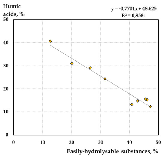 It is believed that in the course of the mineralization of labile compounds (WSS and EHS), the formation of simple chemical substances (CO2, H2O, CH4, etc.) occurs, while the products of partial decomposition are involved in the process of humification—the synthesis of new aromatic compounds (HA) [63]. The fact that, in the process of humification, the accumulation of humic acids occurs due to the condensation of the decomposition products of the easily-hydrolysable part is confirmed by a pronounced correlation between the content of HA and EHS (Figure 8). Thus, the EHS content seems to be a sensitive indicator of changes in the transformation of peat organic matter under the influence of anthropogenic load.