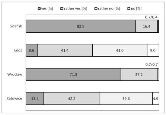 The results showed a completely different image for Katowice and Łódź than the image of Gdańsk and Wrocław. The associations with cities for a rich historical heritage were definitely more positive. In the case of Wrocław, the first ten most popular associations were of a positive or neutral nature, and the most frequently indicated negative association was ‘overcrowded’. This was indicated by only 2.8% of the respondents (the thirteenth most frequently indicated association). The results were similar for Gdańsk. However, in this case, as many as 5.7% of respondents (the fifth most frequently mentioned association) noted that the city is ‘distant’. Additionally, slightly more people indicated the ‘overcrowded’ association in this case (4.6%, the eleventh most frequently indicated association). It should be emphasised that both cities were seen within the framework of the same associations. Both cases were dominated by the same three associations (although in a slightly different order). According to the respondents, both cities are ‘full of energy’, ‘cultural’ and ‘historical’. In both cases, these three associations were the only ones that received more than 10% of the responses, and also, in both cities, the subsequent associations received clearly fewer responses.