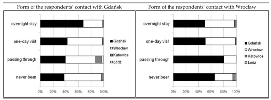 After determining the general attitude of the respondents towards the studied cities, an attempt was made to determine the nature of the respondents’ direct contact with these cities. The respondents could define their contact as passing through, staying as visitors without an overnight stay, or for tourist purposes with an overnight stay (Table 2). As many as four out of ten respondents had never visited Łódź, and another four in ten had only passed through the city. An equally high percentage of contact only in the form of passing through the city was recorded in the case of Katowice. The city’s tourist ‘experience’ in the case of Gdańsk and Wrocław concerned over 70% of the surveyed population, including over half of the respondents, who indicated the staying overnight option. Therefore, in the case of a stay in cities such as Gdańsk and Wrocław, the duration of stay for tourist purposes with an overnight stay can be interpreted as influencing the opinion of how attractive it is (Figure 3). However, no significant relationship between the form of respondents’ contact with Katowice, Wrocław, Łódź or Gdańsk, or the selection of the most attractive city was found (Table 2). These were weak negative and positive correlations. Low values of the correlation coefficient also indicated an attempt to juxtapose forms of contact with opinions of how attractive the cities in the questionnaires are (Table 2).