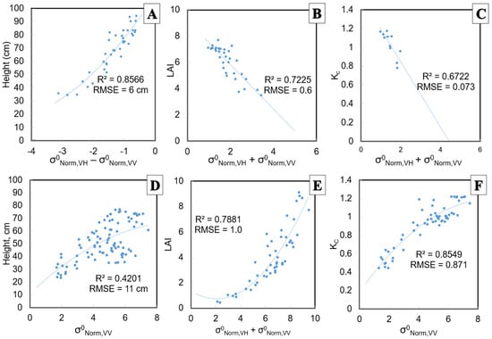 The normalization of σ0 is achieved by multiplying lower σ0 values obtained under shallower local incidence angles by higher θ values than the higher σ0 values acquired under steeper local incidence angles. In this study, different VV and VH polarization combinations of normalized σ0 values were used to model Kc, LAI, and crop height. The models described below (Equations (3)–(5)) were produced using polarization combinations that showed the best R2 and RMSE values. The following polarization combination was used to model Kc and LAI in wheat, and LAI in processing tomatoes: