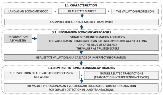 New Institutional Economics theory on transactions has increasingly been promoted to deepen the understanding of socio-economic systems in the previous decades [54]. Moreover, the institutional analysis of decisions relating to environmental resources and nature have gained growing interest (for the case of land see in particular [52,55]). Having discussed the specificity of real estate as an economic good in Section 3.1, a final closer look at this literature is taken as it offers further insights into the role of the valuers’ accompanying organizations and rules. For example, Williamson [56] concluded that specific characteristics of good and transactions (such as asset specificity, uncertainty, or frequency) explain the extent of transaction costs and respective institutions which develop as mechanism to reduce these transaction costs.