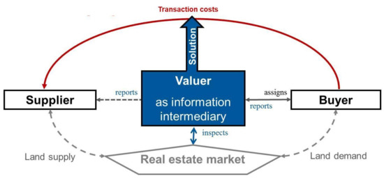 According to economic orthodoxy, market price is the single coordinating market mechanism needed to affect a transaction between buyers and sellers. However, as Coase [26] pointed out, institutions evolve next to the pure market mechanism in order to reduce transaction costs. The Coase’ian transaction cost approach enables us to establish an initial outline of the economic role of valuers as an ‘institution’ of structured information intermediation that reduces uncertainties and market risks for buyers or sellers, thus reducing overall transaction costs (TCs). The understanding of TCs in this approach includes expenses related to searching, information gathering and bargaining which are incurred by using the market as vehicle in order to transact a good. As an experienced ‘market maven’, the valuer takes up an intermediate position as an expert on assessing the quality of land and, based on this expertise, assesses the potential benefits (based on the best usability) and, accordingly, the value of this economic good. As a result, land supply and demand are not negotiated directly between the seller and potential buyer but instead through the intermediating valuer. He provides a valuation report aimed at reducing the risks and uncertainties in the complex real estate market.