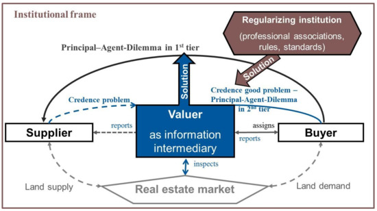 Departing from Nelson’s concept of experience good, the market of real estate can be economically improved (in terms of higher utility) by the existence of an institution that offers guidance (i.e., the valuer). The valuer reduces uncertainties for his client. For the client the benefits can be assumed to be larger than the costs, thus net beneficial. However, it entails a client–valuer internal relationship, which is evidently facing asymmetric information and needs trust, i.e., it has potential of developing into a credence good. The valuation assessment is accepted as a price by market participants only if they trust the valuer, as otherwise the credence problem would occur. Solving the problem of imperfect information in the first tier (land as durable experience good) creates another imperfect information problem (trust into the valuer) as a second-tier problem.