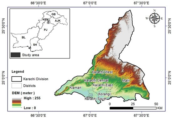 Karachi, the provincial capital of Sindh, is Pakistan’s largest and most densely populated megacity. It is the principal industrial center, seaport, and financial and commercial hub. Karachi Urban Agglomeration (Karachi UA), extending over 3527 km2, is located on the coastline of the Arabian Sea, between 24°45′ N to 25°15′ N and 66°37′ E to 67°37′ E (Figure 1). Karachi is mainly made up of flat rolling plains with hills on the western and northern boundaries. The southern and southeastern banks of the Malir River have a contagious linear concentration of urban settlements [].