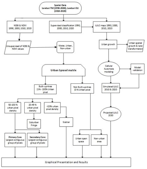 Karachi, Pakistan’s largest city, has seen massive urban growth in recent decades not only in the city’s center, but also in the surrounding suburbs []. If the urban land expansion rate is higher than the population increase rate, the population density in the urban area will significantly decline, and the phenomena of urban sprawl will occur. Due to institutional inefficiency and governance failure, rural lands have been converted into residential and industrial areas without considering the urban planning schemes in Karachi []. The massive conversion of rural lands for urban areas has caused the sprawl phenomenon since 2000, which has led to loss of agricultural lands, an increase in commuting costs, and flooding []. The unplanned urban sprawl has also resulted in a range of social problems such as a lack of health care, shortage of education facilities and infrastructures, an increase in criminal incidents, and sociocultural imbalance [,,]. The introduction of new urban forms and structures that adapt to climate change issues can mitigate the environmental problems caused by dispersed urban area growth and create more efficient urban economies []. Therefore, the spatiotemporal modeling of urban sprawl is crucial to better understand the changing urban patterns of Karachi divisions, thus helping local governments in prioritizing the demands of the local population and formulating strategies and practical solutions to achieve the goal of urban sustainable development.
