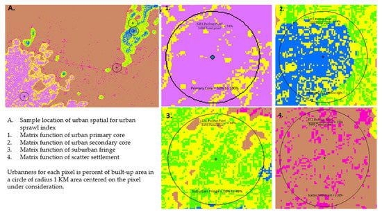 Depiction of the function of the urban sprawl matrix and urban spatial pattern. The percentage of the built-up area in a 1000 m radius circle centered on the pixel under examination is the pixel’s urbanness.