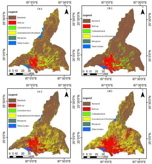 LULC map of Karachi in (a) 1990, (b) 2000, (c) 2010, and (d) 2020.