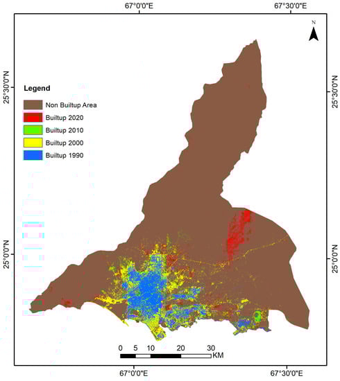 The increase in urban areas in different districts of the study area is illustrated in Figure 5. It was observed that districts near coast and far from the core area (Karachi Central, South, and East districts) had a record high urban growth from 1990 to 2020, particularly in the Malir (417.92%), West (279.38%), and Kiamari (257.05%) districts (Table 4). Among the core areas, the East district of Karachi experienced a higher increase in the built-up area than that in the Central and South districts of Karachi. The central city’s congestion caused outgrowth at the periphery of the megacity during the study period. As a main driver of built-up area growth, the density of the population in Karachi has constantly been increasing over the last three decades. The population of central city has remained highly concentrated, and its population increased from 1.8 million in 1990 to 3.09 million in 2020. Simultaneously, the population of the suburban Malir and West districts increased from 0.8 million and 0.7 million in 1990 to 2.8 million and 2.23 million in 2020, respectively [].
