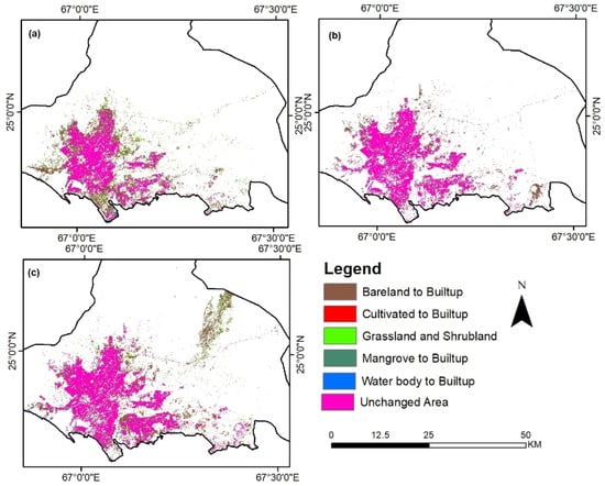 Spatial pattern of land transformation in Karachi during the periods of (a) 1990–2000, (b) 2000–2010, and (c) 2010–2020.