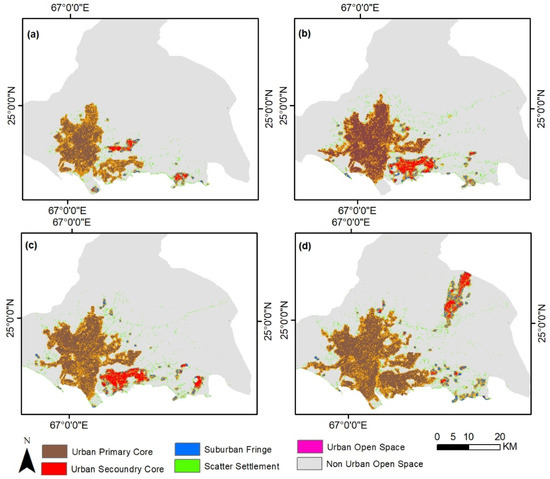 An urban sprawl matrix was utilized to examine urban expansion dynamics and measure urban spatial patterns in Karachi []. For the categorization of urban spatial patterns, matrix functions based on urban pixels were used. Using the urban sprawl matrix, the study area was divided into six classes, namely, the urban primary core, urban secondary core, suburban fringe, scatter settlement, urban open space, and non-urban area (Table 2 and Figure 3).