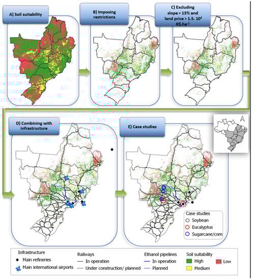 Considering the aim of producing SAF, it would be important to minimise the carbon footprint in transporting feedstocks and SAF, and, in this sense, Figure 2D combines the areas available for biomass production with the existing and planned infrastructure (e.g., railroads, pipelines, some oil refineries, and main international airports). The last image (2E) shows, as an illustration, the location of possible new producing sites of eucalyptus, soybean, sugarcane, and corn considered in the case studies performed in this work.