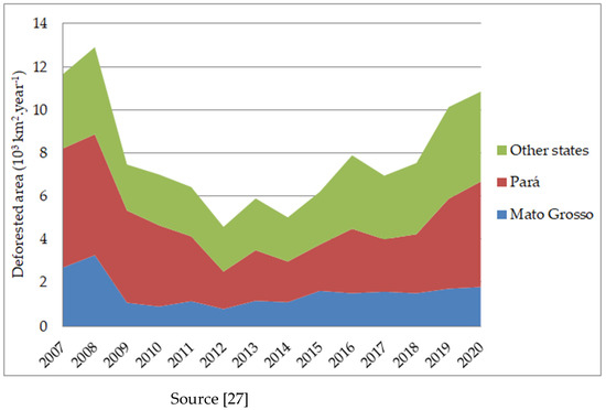 Pará is completely within the Amazon biome. Based on satellite images, the monitoring of deforestation in the Amazon indicates that, since 2008, 43% of deforestation (42 out 99 × 103 km2) was in Pará [27]. As can be seen in Figure 3, deforestation in Pará has grown in recent years, as in the entire Amazon region, and the results are even worse for 2019–2020. Moreover, in Pará there are, proportionally, a large number of reported violations of land use rights (see Supplementary Material) and, historically, in Brazil, land tenure conflicts have been closely related with deforestation [28,29]. In total, as the aim of the assessment presented here is the production of SAF, consideration of the production of feedstocks in Pará seems to be unjustified, except in the case of palm oil (not addressed here).
