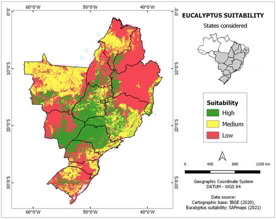 Suitability map for eucalyptus cropping in the 12 Brazilian states assessed.