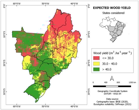 As an illustration, Figure 4 shows the resulting suitability map for eucalyptus. Figure 5 shows the map of expected yields of eucalyptus (estimated as average annual increments over a seven-year cycle), while Figure 6 shows the map of expected wood costs in the field, after harvesting. Other maps are presented as Supplementary Materials.