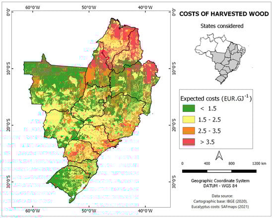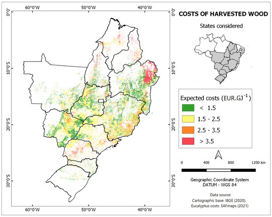 Expected costs of wood after harvesting, indicating only areas in which eucalyptus cropping could be assessed.