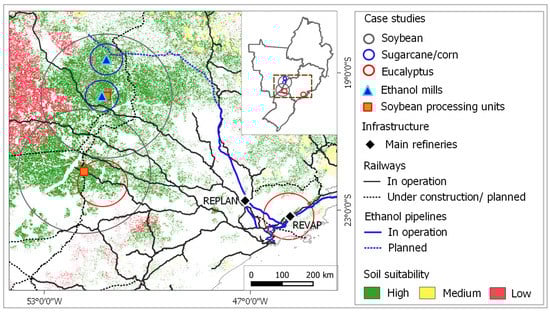 Figure 8 shows the location of the six considered case studies. The circles of influence were plotted over the map of soil suitability, and the figure also highlights the existing railways, the existing and planned branches of the ethanol pipeline, and the location of the two oil refineries where SAF production would take place.