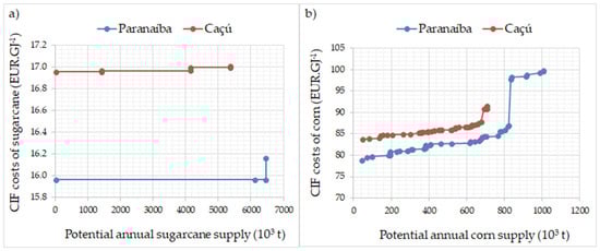 (a) Supply curves of sugarcane at the distilleries that would be located close to Paranaíba (MS) and Caçu (GO), (b) Supply curves for corn at the distilleries in both sites.