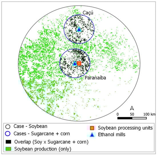 It can be seen that almost all of the spots on which sugarcane production would be viable are coincident with those on which soy would also be viable. Thus, the evaluation of the potential of different feedstocks requires more care as there is a clear trade-off. In the case shown in the figure, if the production of sugarcane was made completely viable around Paranaíba (MS) and Caçu (GO), soy production in Paranaíba would be impacted by only 6%. On the other hand, the large-scale production of soy in this area can completely prevent the production of sugarcane in both studied areas.