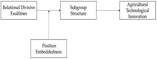 The participation of firms in an inter-organizational cooperation network has become one of the essential ways to enhance the potential of technological innovation. However in practice, network members are not entirely interconnected. In other words, members of an inter-organizational network do not need to have a cooperative relationship with all the members of the network. Only some specific partners are selected for cooperation, leading to the existence of local tight sub-networks [14]. In this article, we discuss the influence of relational divisive faultlines on the structure of subgroups due to the uneven distribution of binary relations among organizations in cooperative networks. We also look at how the subgroup structure produced by the relational divisive faultlines affects the network operation in the cooperative network. Is there a conditional mechanism in the process of relational divisive faultlines affecting the cooperative network? We try to solve these problems. In this article, technological innovation represents the result of cooperation network operation, and the concept of the “faultlines—subgroup—result” model construction in faultlines-related literature is followed. The main research contents are as follows:(1) the direct influence of relational divisive faultlines on subgroup structure; (2) the direct influence of subgroup structure on technological innovation; and (3) the moderating role of position embeddedness between relational divisive faultlines and the subgroup structure. The conceptual model is shown in Figure 1.