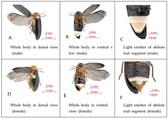 According to two year-long research projects focused on L. unmunsana [23,24], it was revealed that the firefly has a one-year life cycle and lives as a larva for the most of its life, followed by the adult stage, which lasts only for approximately two weeks. The adults are normally active from late May to mid-July and their time of appearance varies depending on the altitude and climate of the habitat. Male and female adults show sexual dimorphism in shape. Males have two light emitters at the end of the abdominal segment, while females have only one. Furthermore, male adults can fly using their elytra and hind wings, but females cannot fly because their hind wings are functionally degenerated. This flightless morph in females impacts their ability to disperse [25].