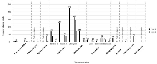 Among the regions in Korea where L. unmunsana population was detected, the Jeju Island had the highest L. unmunsana population counts, with densities of more than 300 male adults per unit area. Additionally, L. unmunsana appeared in other regions (including Busan City, Okcheon-gun, Gyeongsan-si, Namyangju-si, Jangseong-gun and Asan-si), but their density was approximately 30 to 50 male adults per unit area. L. unmunsana populations were nationally distributed and appeared from late May to mid-July. The time of appearance varied regionally; from late May to mid-July in inland areas and from mid-June to mid-July on the Jeju Island. In particular, the fireflies appeared later on the Jeju Island, although it experiences a warm and humid climate in all seasons. Furthermore, results of genetic analyses indicated a difference in the genetic distance between populations on the Jeju Island and those in inland areas. However, these findings require further investigation.