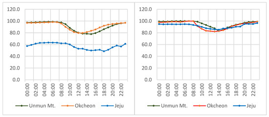 Though there is no major river or lake on Jeju Island, the humidity derived from plentiful surface water running through a wide buffer strip along Mt. Halla (Figure 4g) reliably substitutes for the humidity otherwise associated with a continuously wet valley (Figure 4a–f,h). As Figure 5 shows, the three major habitats for L. unmunsana (Okcheon and Mt. Unmun for inland conditions and Jeju for island conditions) had relatively high daily mean humidity levels.