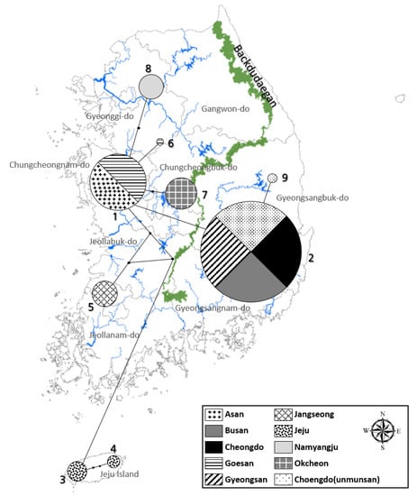 The genetic diversity of each population was analyzed through an analysis of molecular variance (AMOVA) test and pairwise differences were determined using Arlequin ver. 3.5.1 [48,49]. Among the 10 selected study sites, the west and east sides of the Baekdudaegan Mountain Range (Figure 1) and Jeju Island were identified to have three separate populations. This was based upon the assumption that the female L. unmunsana’s inability to fly could have separated the populations due to mobility limitations. The genetic variations among groups, among populations within a group and within populations were determined using the standard AMOVA test. Finally, genetic distances between haplotypes were assessed based on pairwise differences.