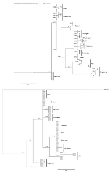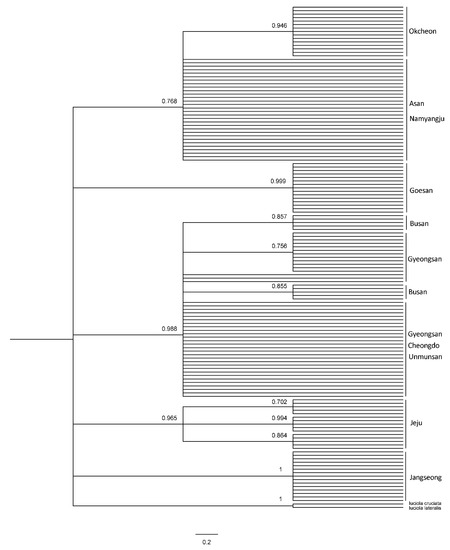 The systematic analysis of the haplotypes of the COII and 16s rRNA genes resulted in one group, comprising firefly populations of the Mt. Unmun, Cheongdo-gun, Busan City and Gyeongsan-si in the BI and ML trees, for both COII and 16s rRNA genes, similar to the network results (Figure 8, Figure 9 and Figure 10). Furthermore, every node value in the BI and ML analyses was supported by 70% or higher on the BI and ML trees using the COII and 16s rRNA genes. However, the correlations between the regions in the trees were not distinct because of low genetic variations. A distinct genetic distance was observed in the network generated from haplotype-based analysis of the Jeju Island populations. However, in the ML analyses, the island populations appeared closer to those in the eastern region of Baekdudaegan, which is unlikely. This is because few or no haplotypes were shared by the populations and each population had already undergone genetic variations over previous years, resulting in unique regional haplotypes.