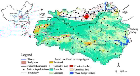 The areas north and south of the Qinling Mountains are located in north-central China (31° N–36° N, 105° E–112° E) (Figure 1), and are divided into the three physical geographical units of the Guanzhong Plain, the Qinling Mountains and the Hanjiang Valley. The Qinling Mountains form the boundary between the subtropical humid and warm temperate humid climate zones in China, being crossed by the 0-degree isotherm and the 800-mm-year isohyet [28].