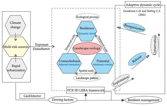 Human environment development promotes the evolution of social ecological systems in four different stages, in which risk exists at all stages due to the system complexity and diversity of risk sources [8]. The 3D model framework depicts the interaction of the integrated human and natural ecosystems’ landscape pattern, ecological processes and external disturbance, focusing on the reciprocal feedbacks inside this comprehensive system [12]. Integrating adaptive cycle theory into LERA captures the dynamic process of the socio-ecosystem adaptation to deal with the risk within an integrated view [26].