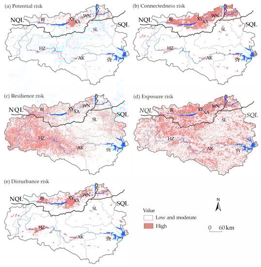 The spatial pattern of the precipitation erosion indicator showed that the SQL was covered by moderate and high-risk values, especially in the upper reaches of the Hanjiang River, while the risk pattern of the drought indicator was contrary to that of precipitation-erosion. For the Shannon diversity index (SHDI) and CONTAG indicator, high-risk regions were centered on the Weihe plain in the NQL and a small fraction distributed in the east of the study area, where there was a mosaic of a single type of impervious land, cultivated land, and forest land. The low and moderate-risk areas for vegetation coverage change occupied almost the whole study area. The risk of drought index pattern had high spatial heterogeneity with high risk in the west and low risk in the southeast of the study area.