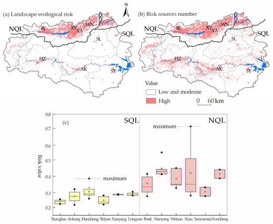 (a) Spatial pattern of the comprehensive landscape ecological risk in the north and south of Qinling Mountains. The high risk is shown in pink and the low and moderate is shown in white; XA is abbreviation for Xi’an city, BJ is for Baoji city, XY is for Xianyang city, WN is for Weinan city, SL is for Shangluo city, HZ is for Hanzhong city, AK is for Ankang city, SY is for Shiyan city. (b) Risk sources number of landscape ecological risk in the study area. The area with a risk source number over 3 is identified as high risk, and the rest is identified as a low and moderate-risk source area. (c) The landscape ecological risk difference in different cities of the north and south of the Qinling Mountains.
