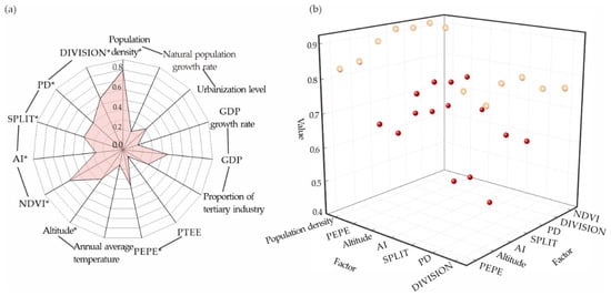The 15 driving indicators of the comprehensive landscape ecological risk were processed to identify influence factors in the study area by factor detection with GeoDetector (Figure 5a). The factors with a level of significance higher than 0.05 were kept as the driving forces of landscape ecological risk, including population density, PEPE, and all ecological background indicators (Table 4).