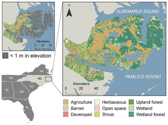 The Albemarle-Pamlico Peninsula is an approximately 4000 km2 region in Eastern North Carolina, USA. It is bounded by the Albemarle and Pamlico Sounds, which are separated from the Atlantic Ocean by a chain of barrier islands. Almost half (47%) of the peninsula lies below 1 m in elevation exposing agricultural lands, forestry operations, and natural coastal forests to impacts from sea level rise.