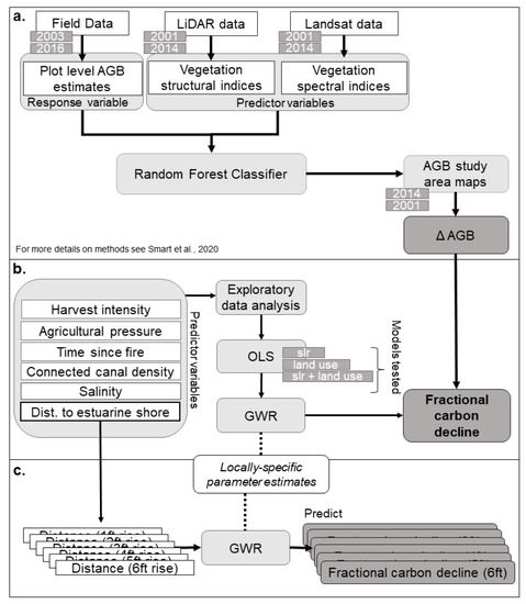 Schematic describing the three main analyses that include (a) mapping aboveground biomass (AGB) change and calculating fractional carbon decline (Section 2.2; for more details on methods [49]); (b) exploratory data analysis to select uncorrelated predictor variables and modeling fractional carbon decline as a function of sea level rise (slr), land-use, or a combination of drivers using nonspatial (ordinary least squares; OLS) and spatial (geographically weighted regression; GWR) regression models (Section 2.3 and Section 2.4); and (c) using the locally specific parameter estimates established from the GWR model to predict future fractional carbon declines by holding all other variables constant and updating the distance to estuarine shoreline variable (Section 2.5).