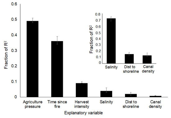 For 52% of the study area, land use and disturbance drivers had the strongest regression coefficients (13% of the total landscape for agricultural pressure, 13% for harvest intensity, and 26% for time since fire), and for 48% of the study area the sea level rise variables had the largest regression coefficients (2% of the total landscape for canal density, 20% for distance to estuarine shoreline, and 27% for salinity). In the southeast portion of the study area, the sea level rise drivers best explained variation in carbon declines (e.g., Figure 6c,d). In the northeast portion of the study area, both land use/disturbance drivers and sea level rise drivers contribute to declines (Figure 6). To the interior, relationships were mixed, with land use drivers most important in areas dominated by agricultural and forestry operations and sea level rise drivers generally most important in interior areas connected to the estuary via canals (e.g., Figure 6b–f).
