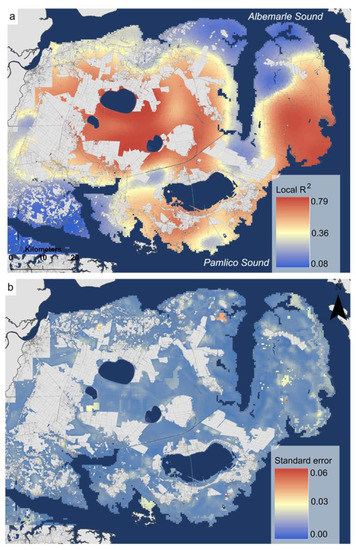 (a) Quasi-global R2 from geographically weighted regression (GWR) model for the Albemarle-Pamlico study area in Eastern North Carolina, USA. Areas excluded from the model are in light grey. Water bodies and the Albemarle and Pamlico Sounds are dark blue. (b) Quasi-global R2 standard error values from the GWR model.