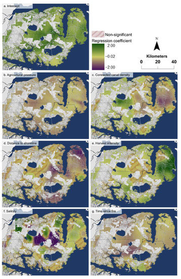 While coastal forests are particularly vulnerable to sea level rise long term, land use activities, resource management (e.g., water use) and other disturbances (e.g., wildfires) are near-term threats. Land use change, and the interactive effects between land use change and sea level rise, will largely determine where and how much carbon is stored in coastal forests [27]. Land ownership in coastal landscapes involves private landowners and operators as well as local, regional, state, and federal agencies [23,28]. The land use decisions of individuals and organizations have regional impacts and necessitate approaches that account for socio-spatial processes in coastal planning, adaptation, and management. These processes often give rise to spatial heterogeneity in the relationships between environmental, land use, and disturbance drivers and coastal forest change. For example, if the relationship between coastal forest health and canal density changes across the study area, we might infer that the relationship exhibits spatial nonstationarity and that there are unmeasured social processes driving these variations. To understand where and when specific planning and management activities will be most successful, it is critical to not only quantify the relationships between coastal forest change and associated drivers of change [29] but also evaluate how these relationships might vary across space.
