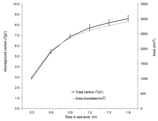 Total area (km2) inundated (grey line; right axis) and total aboveground carbon, measured in teragrams of carbon (TgC), lost (black line; left axis) and associated standard errors from sea level rise inundation. The sea level rise inundation model, from the National Oceanic and Atmospheric Administration, represents inundation under the intermediate–high sea level rise (slr) scenario (ranging from 0.3 to 1.8 m) or Representative Concentration Pathway 8.5.