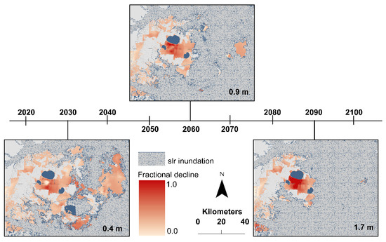 Fractional carbon declines associated with sea level rise inundation using the National Oceanic and Atmospheric Administration’s Sea level rise (slr) inundation models for the intermediate–high sea level rise inundation scenario (values range from 0.3 to 1.8 m). Fractional carbon declines estimated using the geographically weighted regression model with distance to estuarine shoreline predictor variable updated with incremental inundation between 0.3 and 1.8 m.