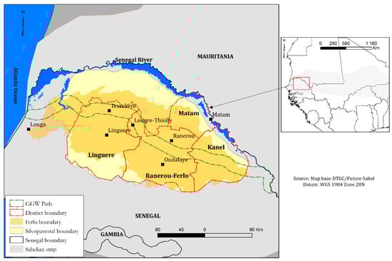 Map of the study area: the Senegalese Ferlo region. The map is centered on the northern part of Senegal, located in West Africa. It highlights the strong overlap among the silvopastoral zone (light yellow), the Ferlo (dark yellow area), and the four districts (outlined in red) where the environment-oriented development projects in this study were implemented: Linguère, Ranérou-Ferlo, Matam, and Kanel. Since it is the current, major environment-oriented project in the area, we also represented the Great Green Wall path (outlined in green).