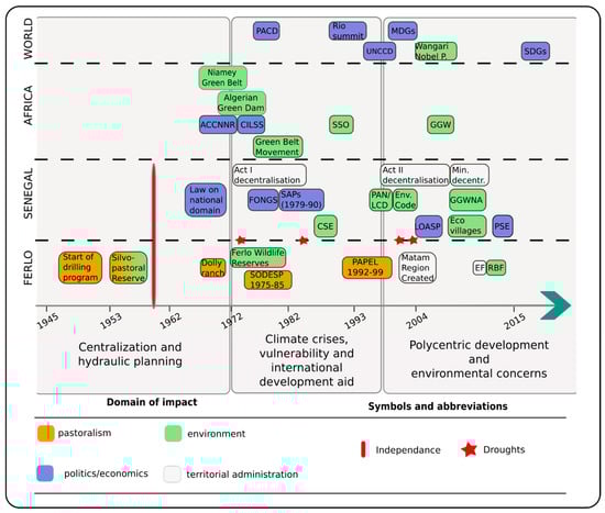 Multi-scale timeline defining three major periods of development in the Senegalese Ferlo region. The figure represents the three periods of development. The different events shaping the development in the Ferlo are represented according to their domain of interest and scale of influence. ACCNNR: African Convention on the Conservation of Nature and Natural Resources; CILSS: Permanent Interstate Committee for Drought Control in the Sahel; CSE: Centre de suivi écologique (ecological monitoring center); EF: “Entente” Ferlo; Env.Code: Environment Code; FONGS: Federation of NGOs of Senegal; GGW: Great Green Wall; GGWNA: Great Green Wall National Agency; LOASP: Agro-silvopastoral Orientation Act; MDGs: Millennium Development Goals; PACD: Plan of Action to Combat Desertification; PAN/LCD: National Action Program to Control Desertification; PAPEL: Livestock Support Project; PSE: Plan for an Emerging Senegal; RBF: Biosphere Reserve of Ferlo; SAPs: Structural Adjustment Programs; SDGs: Sustainable Development Goals; SODESP: Society for the Development of Livestock in the Silvopastoral zone; SSO: Sahara and Sahel Observatory; UNCCD: United Nations Convention to Combat Desertification.