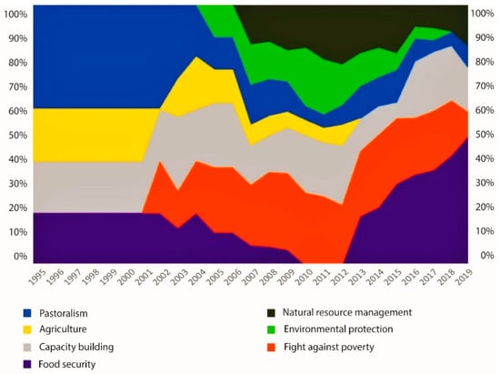To classify the projects, we first established a typology according to their objectives. Seven main objectives were identified (Table 1). As illustrated in Figure 3, the evolution of these objectives points to an overall diversification over time. From 1996 to 2000, there was a relatively narrow focus on four objectives: pastoralism, agriculture, capacity building, and food security. From the early 2000s onwards, objectives began to diversify, with the relative importance of each varying over time. For example, agriculture which represented roughly 20% of the project objectives up until 2000, gradually decreased and became inexistent since 2013.